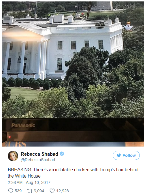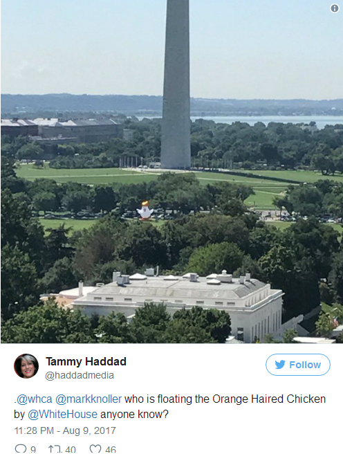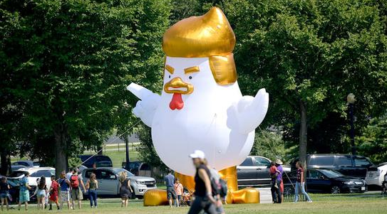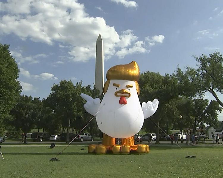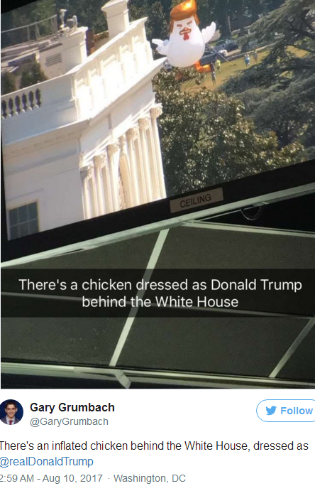 這個充氣公仔在美國被稱為「唐老雞」(Chicken Don),被用來諷刺美國總統特朗普的軟弱無能。巨型「唐老雞」面對白宮大樓,露出生氣的樣子,很明顯特朗普身在白宮的話,也可以清楚的看到它的身影。