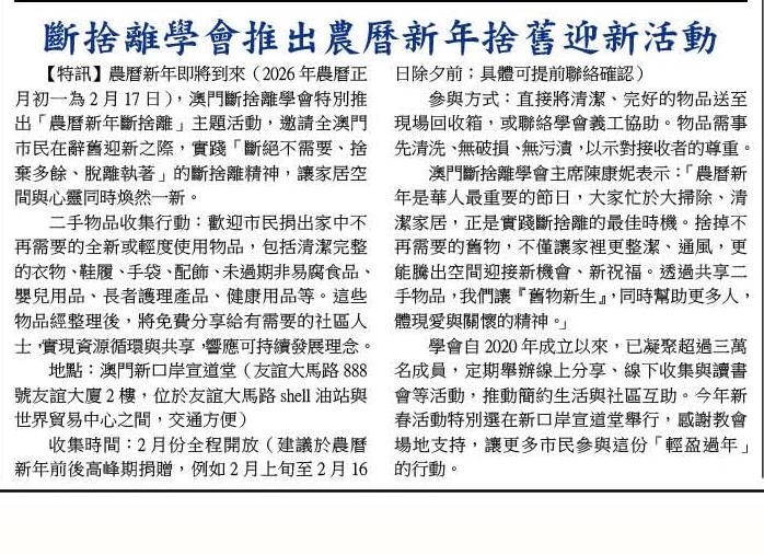 【特訊】農曆新年即將到來(2026年農曆正月初一為2月17日),澳門斷捨離學會特別推出「農曆新年斷捨離」主題活動,邀請全澳門市民在辭舊迎新之際,實踐「斷絕不需要、捨棄多餘、脫離執著」的斷捨離精神,讓家居空間與心靈同時煥然一新。