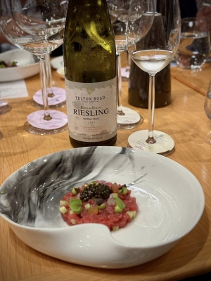 晚宴的菜品由美獅美高梅 Grill 58 余立期主廚 Chef Basil Yu 及其團隊精心設計,序幕由一道日式吞拿魚塔塔拉開。這道菜以淡醬油調味,巧妙凸顯吞拿魚的天然鮮味,檸檬泥與牛油果的加入,帶來類似奧塔哥氣候的陽光清新感,最後點綴的魚子醬,更增添了額外的鹹味層次,讓口感變得豐富立體。與之搭配的,是飛騰酒莊2024年雷思令——這款乾型葡萄酒風格突出,一開瓶便散發出春日花卉、滑石與果園水果的活力香氣,口中滿是成熟蘋果與梨子的清甜,伴隨著粉紅葡萄柚的清爽與礦物質的悠長尾韻。作為乾型酒,它的豐潤感出人意料,正是這份飽滿的果味力量,支撐起酒液的清爽骨幹,與吞拿魚塔塔的鮮嫩、魚子醬的鹹鮮形成完美呼應,讓每一口都充滿清新與平衡。