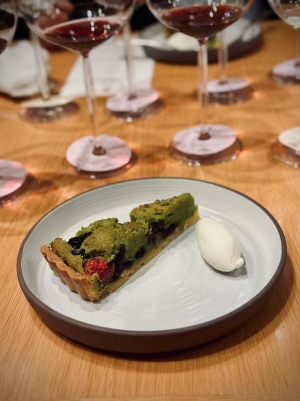 晚宴的收尾,以一道法式莓果批溫柔落幕。批身鬆軟綿密,夾雜著時令雜莓的酸甜,開心果奶油的香濃與忌廉的絲滑環繞其間,為整場盛宴帶來清爽而甜美的收尾,也讓賓客們在回味酒食風味的同時,感受到舌尖味蕾的甜蜜。