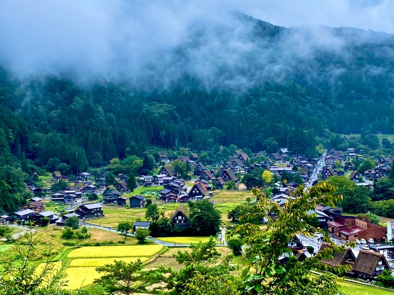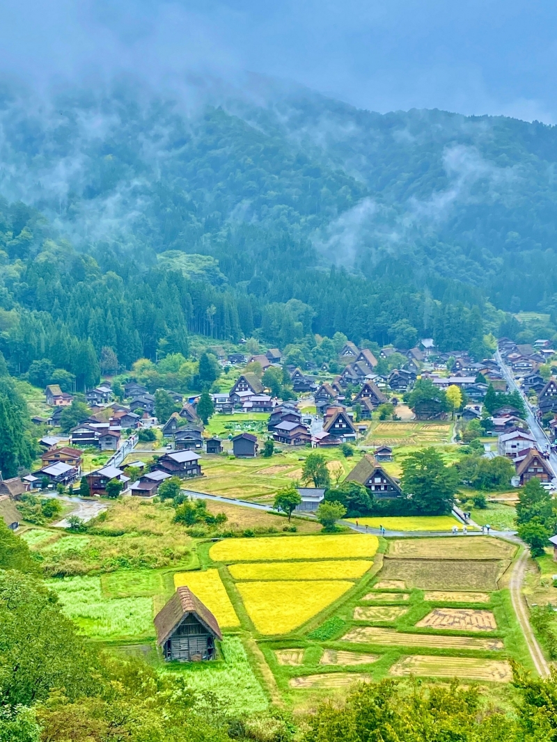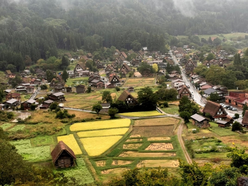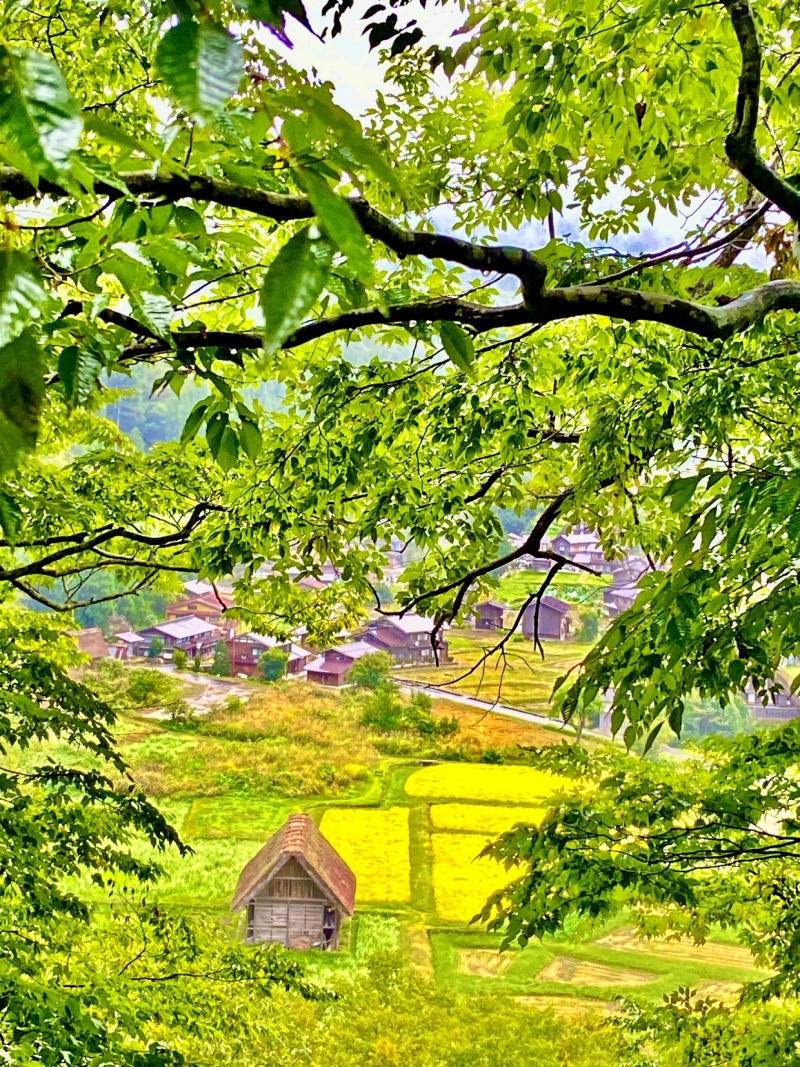 白川鄉山野村落盡收眼底, 只見山下田園間