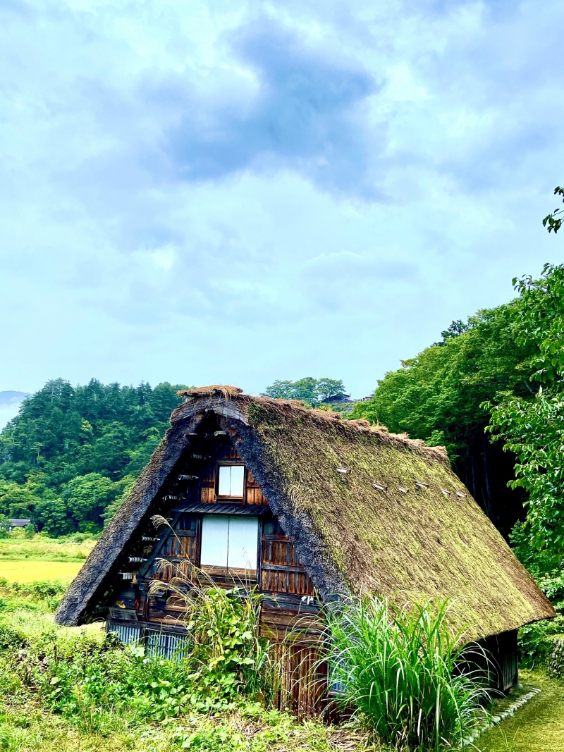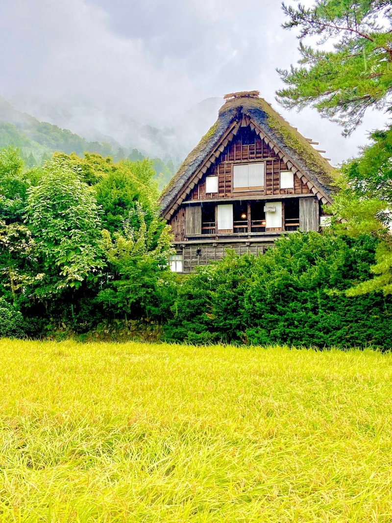 一片綠意金黃稻田之色、茅草合掌屋點睛其中,