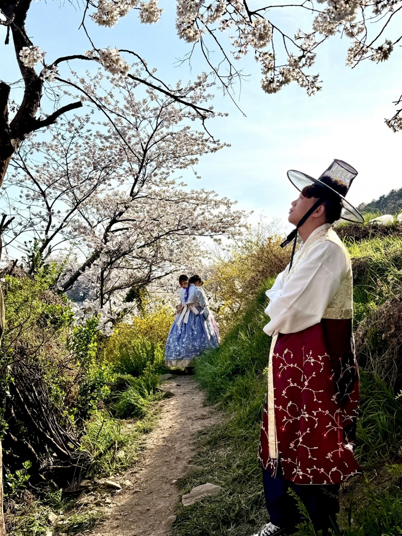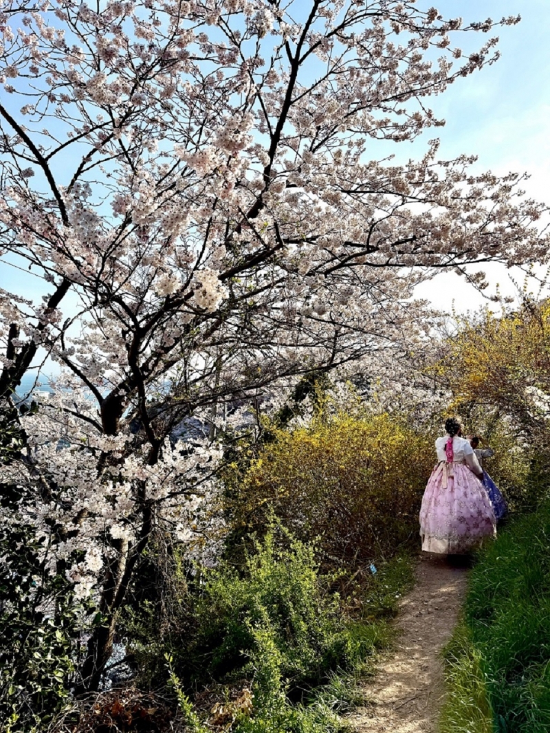 斜坡路上剛好見一穿著韓國民族服的女子身影,