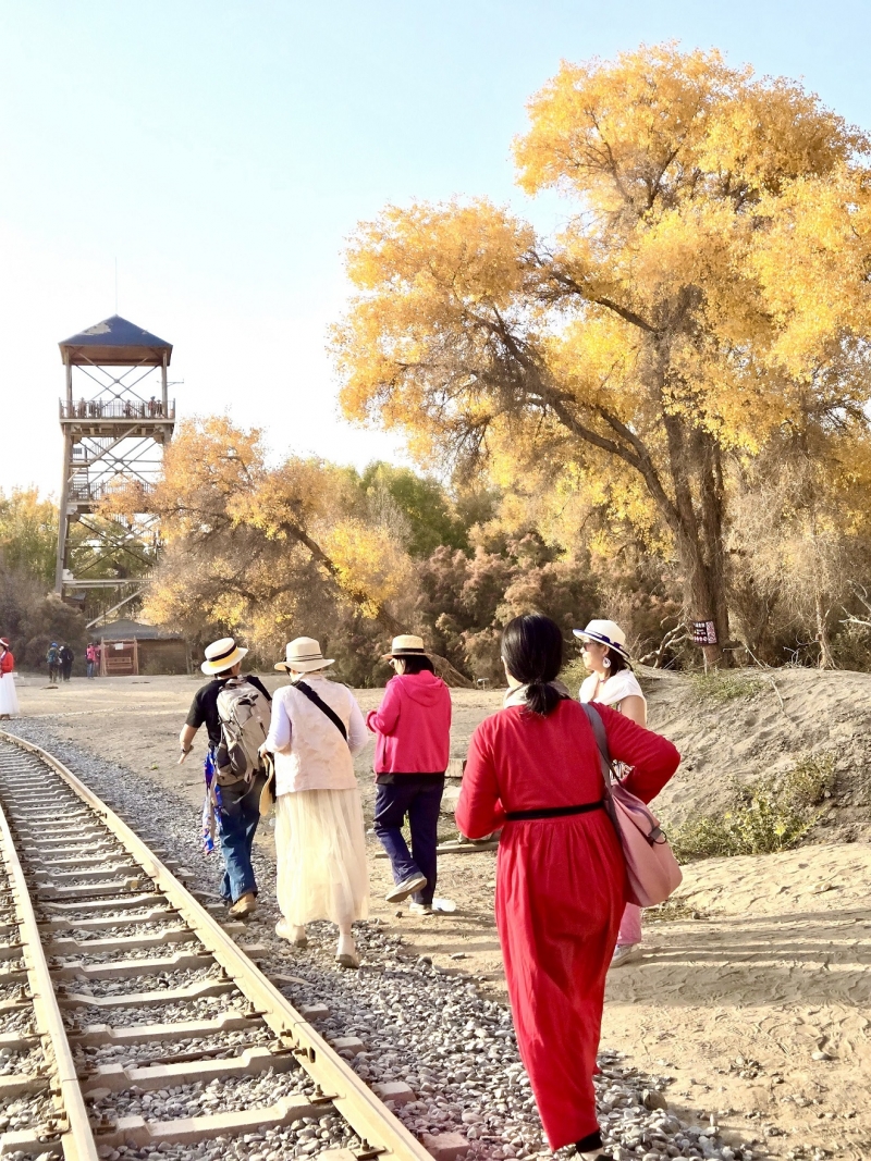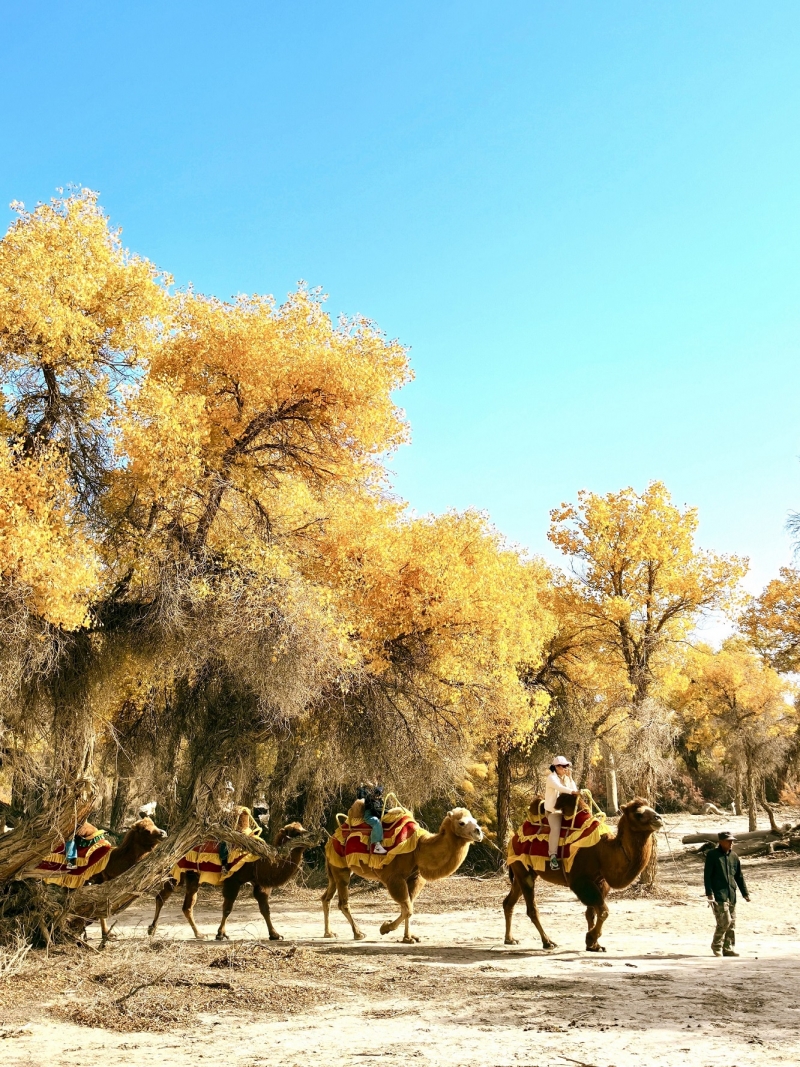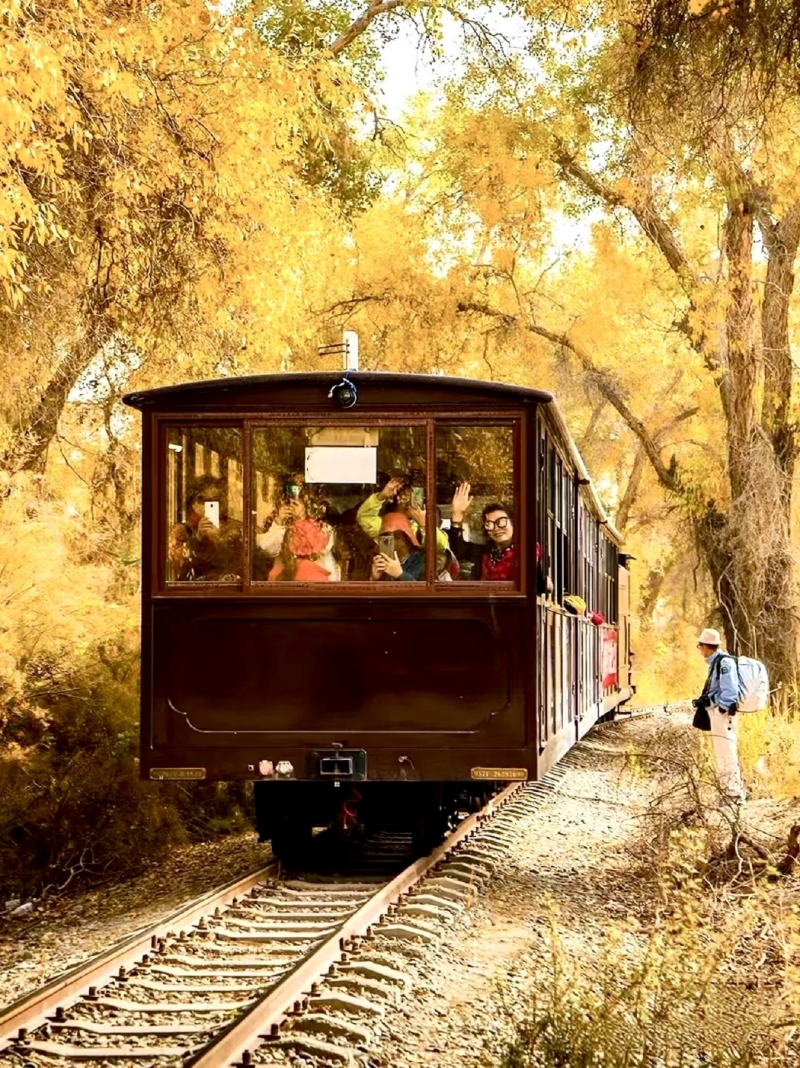 在胡楊林中穿過。 遊客時間充裕的可以乘坐該復古